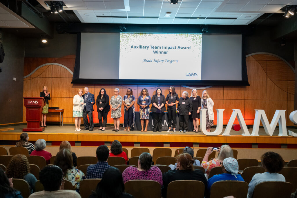 The UAMS Auxiliary Team Impact Award is intended to recognize outstanding service by two or more individuals, i.e. student, staff, faculty and volunteers who collectively make up a team, and are awarded to one team each year. The 2025 Award was The Institute for Digital Health and Innovation’s Brain Injury Program.